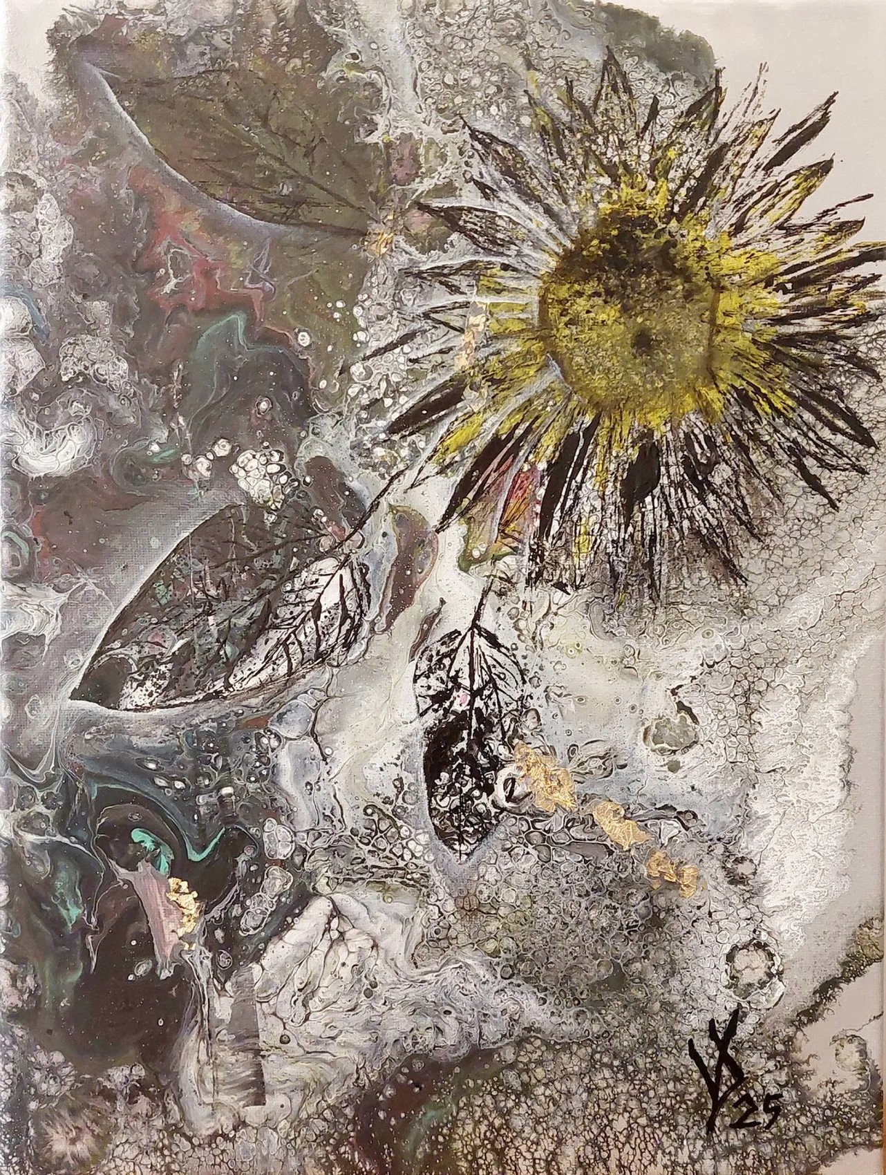Tässä abstraktissa teoksessa luonto näyttää sulautuvan ajan ja valon virtaan. Keskuskuva muistuttaa auringonvalossa kylpevää kukkaa, joka kohoaa esiin tekstuurien ja pyörteisten muotojen sumusta — valon symboli, joka säilyy jopa varjoissa. Harmaan ja kullanhohtoisen keltaisen sävyjen pehmeät siirtymät luovat syvyyden ja liikkeen tuntua, kuin itse luonto hengittäisi maalin läpi.